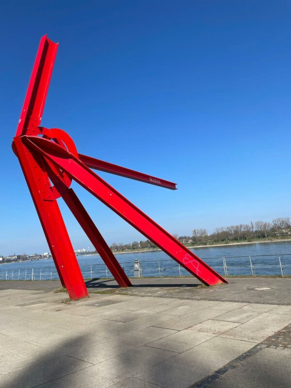 Als nächstes ging es zum neuen Plenarsaal, der vollständig aus Glas gebaut war. Er sollte sehr offen und „demokratisch“ wirken, da man von außen in ihn hineinschauen kann. Direkt dahinter steht am Rhein ein rotes Denkmal, welches direkt in Richtung Berlin zeigt.