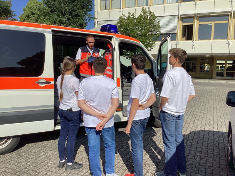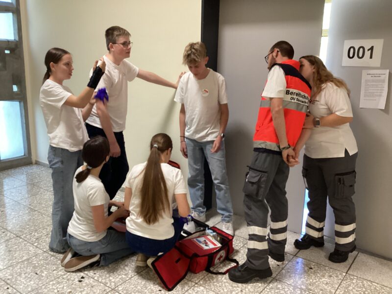 In der AG haben die Jugendlichen nicht nur gelernt, was in Notfällen zu tun ist, sondern auch, wie sie Gefahren frühzeitig erkennen können, bevor sie eintreten. Ein wichtiger Aspekt ihrer Ausbildung ist die Übergabe von verletzten Personen an den Rettungsdienst bei größeren Notfällen. In den wöchentlichen Schulsanitätsdienst-Stunden erweitern die Schulsanitäter*innen ihr Wissen und ihre Kompetenzen in Erster Hilfe. Dabei spielt die Betreuung von verletzten Personen eine große Rolle.