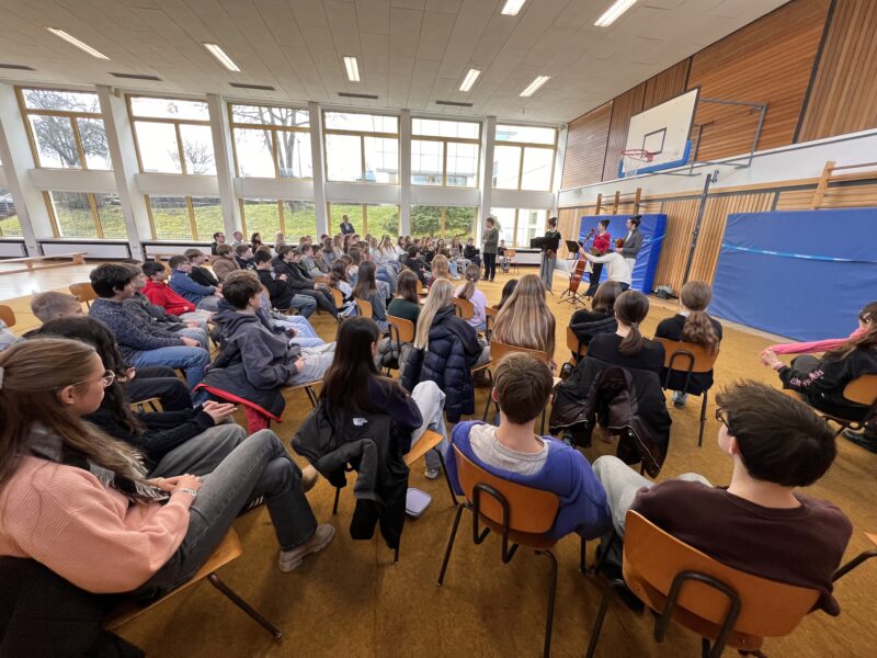Gerade der Einblick in professionelles Arbeiten war für die Musikgymnasiasten, die selbst schon oft in ähnlichen Besetzungen gespielt haben, von unschätzbarem Wert. Dementsprechend dankbar und geradezu euphorisch fielen dann auch einige Kommentare im Anschluss aus: „Das war toll, wie die zusammen gespielt haben, das will ich auch mal irgendwann können!“ „So klar habe ich die Sonatenform noch nie rausgehört, das war viel besser als von CD!“ „Besonders schön fand ich, dass die Musiker sich noch so viel Zeit genommen haben, um unsere Fragen zu beantworten – vielen Dank!“ „Ich hoffe, die kommen bald noch mal wieder, da habe ich viel gelernt!“