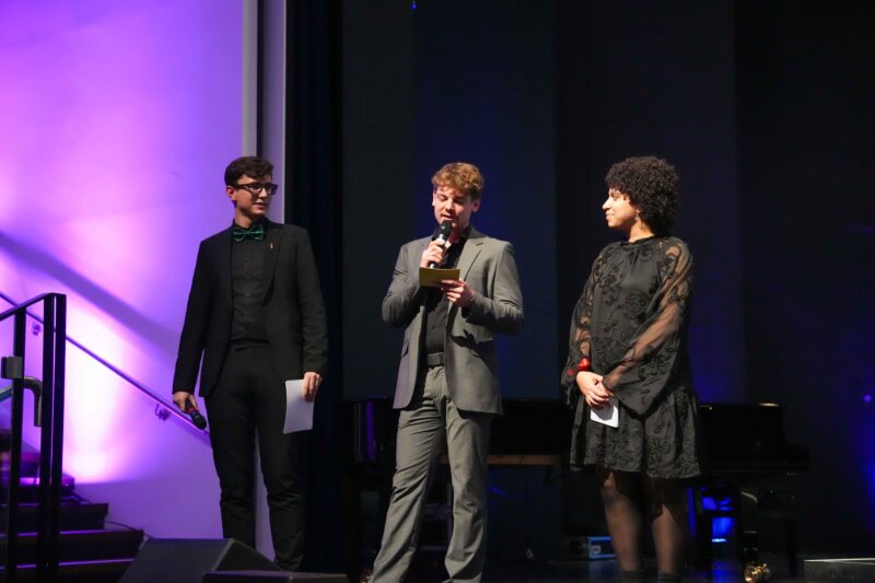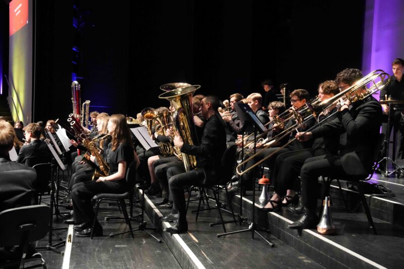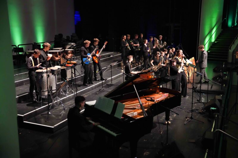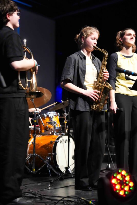 Phoebe Kramm und Jakob Schmidt aus der MSS 13 führten, begleitet von Marvin Frey, dem Instrumentallehrer für Jazztrompete, charmant durch das Programm. Besonders berührte Phoebe die Zuhörenden mit ihrer emotional und authentisch dargebrachten Dankbarkeit für den Zusammenhalt innerhalb der Schulgemeinschaft durch das jahrgangsübergreifende Zusammenspiel in den Ensembles, den sie besonders während ihrer Zeit im Internat als eine familiäre Gemeinschaft erlebte. Diese familiäre Atmosphäre zeigte sich auch während des Konzerts, bei dem viele ehemalige SchülerInnen ihre ehemaligen Ensembles unterstützten.