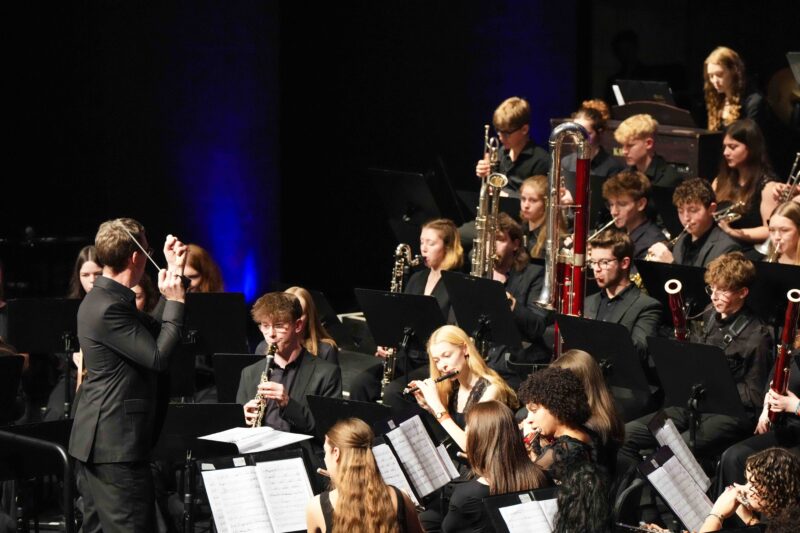 Das Konzert wurde durch das Sinfonische Blasorchester unter der Leitung von Philipp Hebgen eröffnet, das den 1. Preis beim Deutschen Orchesterwettbewerb in der Kategorie „Jugendblasorchester“ sowie beim internationalen Musikfestival in Neerpelt errang. Mit dem Werk „Angels in the Architecture“ von Frank Ticheli präsentierten die Musiker eine Mischung aus verschiedenen musikalischen Stilen. Hebgen erklärte, dass das Werk die Bedeutung von Licht und Schatten thematisiere und die Zuhörer dazu einlade, selbst zu bestimmen, was die Gewinner dieser beiden Seiten seien. Das Orchester beeindruckte mit Solisten, spannenden Percussioninstrumenten und berührender gesanglicher Untermalung.