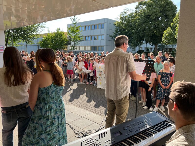 Der letzte Schultag am Landesmusikgymnasium wurde traditionell mit dem „Schlussakkord“ eröffnet, der einen Rückblick auf das vergangene Schuljahr bot und einen Ausblick auf die kommenden Herausforderungen und Erlebnisse gab. In diesem Jahr wurde der „Schlussakkord“ von Axel Müldner und Christof Haxel-Schamuhn vorbereitet und von dem Stufenchor der Jahrgangsstufe 10 unter der Leitung von Miriam Post musikalisch umrahmt. Die bewegenden Momente und die gemeinsam erlebten Erfolge des Schuljahres wurden dabei gebührend gewürdigt.