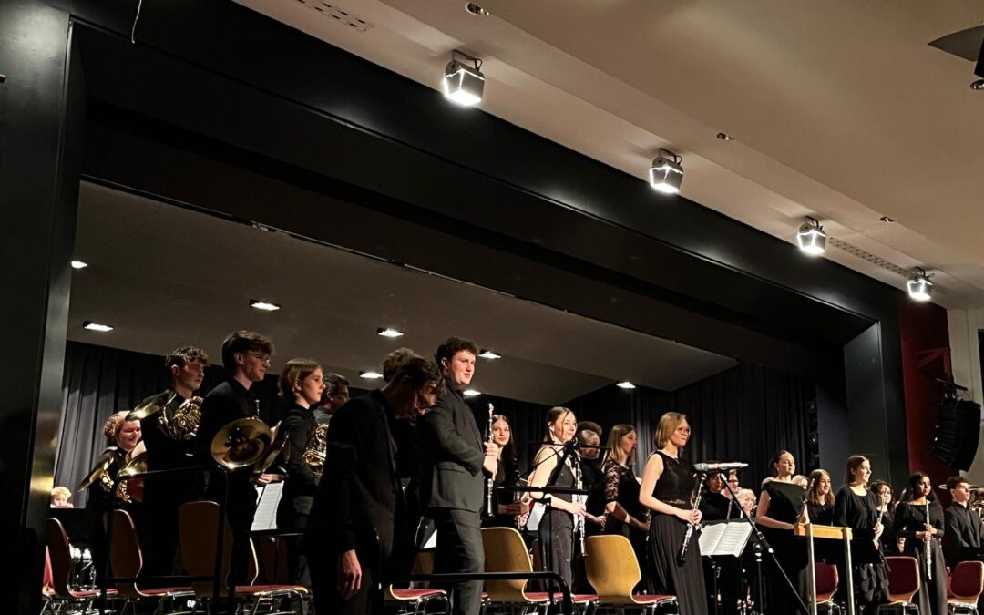 Im Konzert kam es jetzt zu einem Werk, das 2012 bei einem Weihnachtskonzert durch das SBO präsentiert wurde und damals durch seine Dynamik einen nachhaltigen Eindruck hinterlassen hatte: das schottische „Highland Cathedral“ wurde vom BVO angestimmt und nach einigen Takten wurden die teils sehr jungen Musiker durch ca. 25 „alte Hasen“ eines zusammengerufenen Ehemaligenensembles der Abiturjahrgänge 2014 bis 2025 ergänzt, die aus dem „Bühnen-Off“ heraus eine Stuhlreihe hinter dem BVO besetzten. Dieses Ehemaligenensemble intonierte dann alleine im Anschluss (mit nur wenigen Aushilfen aus dem SBO) noch ein zusätzliches Stück (Cry of the last Unicorn), das schon nach knapp 40 Minuten einmaliger Probenzeit am selben Nachmittag in bemerkenswerter Qualität auf die Bühne gebracht wurde.