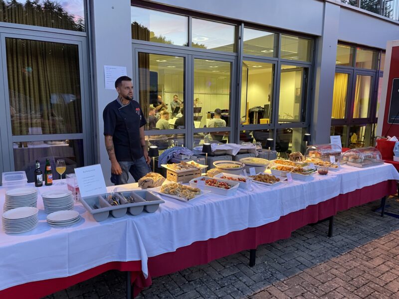 Für das leibliche Wohl war bestens gesorgt: Die Küche unter der Leitung von Alexander Stahlschmidt bot ein vielfältiges Buffet mit Vor- und Nachspeisen an. Zudem stellte der ehemalige Schüler Robin seinen Foodtruck zur Verfügung. Der Getränkeverkauf wurde von der MSS13 übernommen.