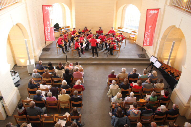 Festungskirche musica vivaAuf Einladung des Evangelischen Kirchenkreises Koblenz gastierten am 18.05. gleich drei Ensembles des Landesmusikgymnasiums in der Festungskirche in Koblenz-Ehrenbreitstein. Das Gitarren-Ensemble „Cantomano“ unter der Leitung von Volker Höh, das Querflötenensemble „flautastique“ unter der Leitung von Karoline Schaeferdiek und „musica viva“, die Kammerphilharmonie der Schule, unter der Leitung von Tobias Simon nehmen allesamt in wenigen Wochen als rheinland-pfälzische Landessieger am Deutschen Orchesterwettbewerb in Wiesbaden und Mainz teil. Die jungen Musiker präsentierten dabei jeweils weite Teile ihrer Wettbewerbsprogramme.