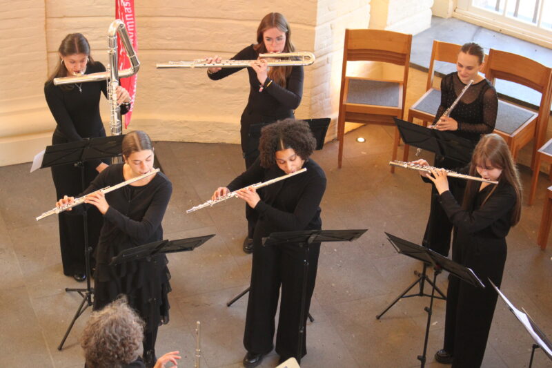 Als besondere Note rundeten drei junge Schlagzeuger aus der Klasse 7 von Herrn Kohmann das Programm mit wunderbaren Klängen ihres eindrucksvollen Marimbaphons ab. Stefan Kohmann war es auch, der den Kontakt hergestellt hatte zu den Organisatoren der Konzertreihe, die nach dem Konzert begeistert ein weiteres Gastspiel der Schülerinnen und Schüler der einzigartigen Landesschule in Aussicht stellten – eine Einladung, die das LMG gerne annehmen wird.