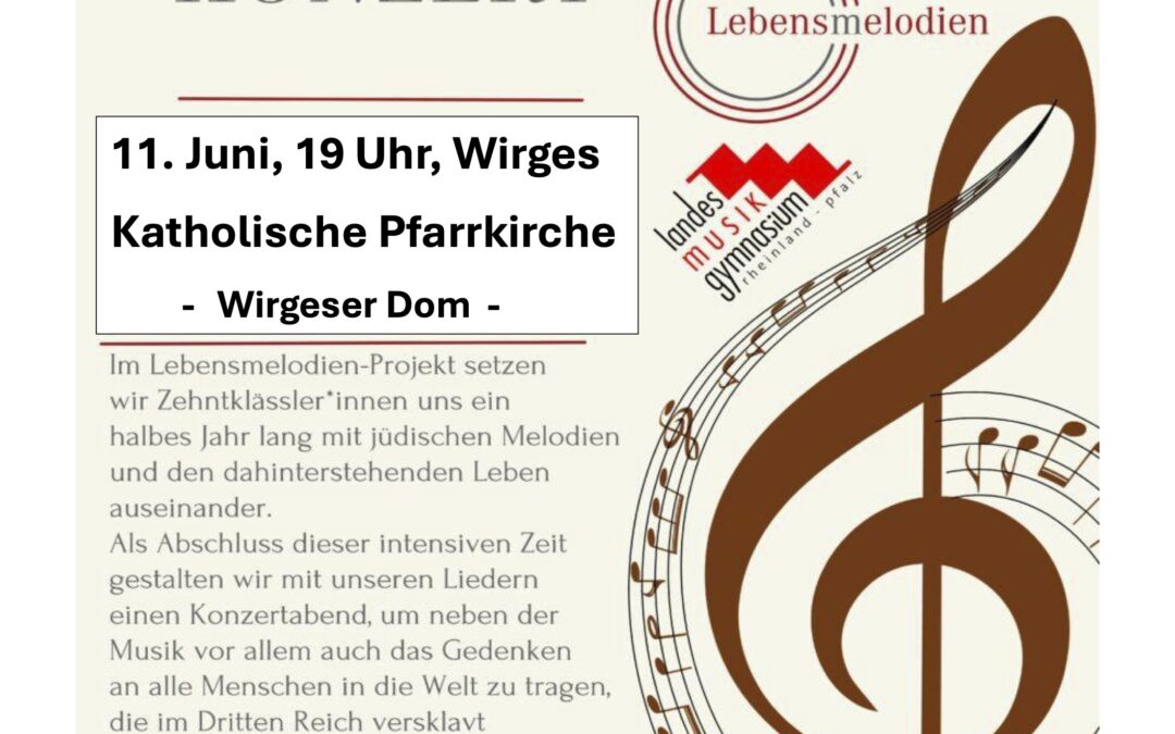 In diesem Jahr führt das Landesmusikgymnasium bereits zum vierten Mal das Projekt Lebensmelodien in der Jahrgangsstufe 10 durch, in dem Geschichte durch intensive Auseinandersetzung erfahrbar wird. Unter dem Titel „Lebensmelodien“ wird die Musik, die in den unmenschlichsten Situationen der Verfolgung und Ermordung zwischen Leben und Tod entstanden ist, in den Mittelpunkt gerückt. Diese Melodien haben den Menschen in den Ghettos und Lagern geholfen, zu überleben oder von dieser Welt Abschied zu nehmen. Hinter den Lebensmelodien, die zwischen 1933 und 1945 komponiert, gesungen, gespielt und manchmal auch aufgeschrieben wurden, verbergen sich die bewegenden Lebensgeschichten jüdischer Schicksale.